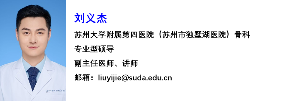 刘义杰,医学博士,临床医学博士后,江苏省科技副总人才,苏州大学优秀人才,苏州市姑苏卫生青年拔尖人才,国际AOspine会员,以第一作者或通讯作者身份发表SCI论文30篇,国内核心期刊3篇,部分研究成果发表在NeurosurgeryThe spine journalEuropean Spine JournalJournal of neurosurgery SpineAdvanced Functional MaterialsIF=19)、Materials Today BioIF=8.7)、ACS Materials LettersIF=9.9)等国际专业学术期刊上,并多次在国内外重要学术会议上报告交流。主持国家级课题2项,省级课题1项,市级课题4项。2018获得苏州市医学新技术引进一等奖,2023年获得江苏省医学新技术引进一等奖,2023年获得苏州市医学新技术引进一等奖2025年苏州市工业园区医学新技术引进一等奖。获得国家实用新型专利4项。每年独立完成脊柱手术300余台,近年来开始致力于脊柱微创手术、机器人辅助脊柱手术以及个体化精准手术。熟练掌握颈椎、胸椎及腰椎退行性疾病及创伤疾病的外科手术治疗。擅长采用OLIF微创治疗腰椎病患、UBE微创治疗颈胸腰病患。江苏省率先开展UBE内镜辅助微创治疗上颈椎畸形,苏州市率先开展UBE内镜辅助微创治疗胸椎管狭窄症,均取得了良好的临床疗效。