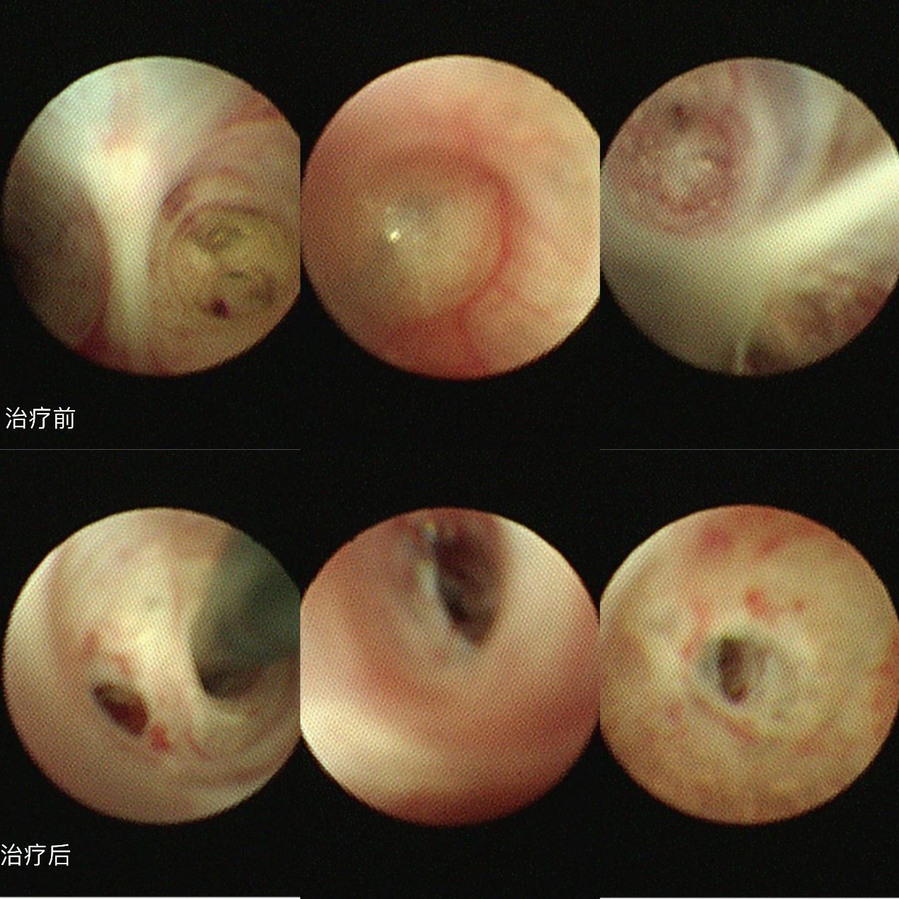 患者第一次支气管镜术前,蒋军红主任团队和麻醉手术科团队充分沟通,做好应急预案,手术操作中使用高流量,纤细的支气管镜缓缓深入肺部。在超细支气管镜视野下,团队清晰看到:左下叶基底段远端的8-9级细支气管已呈闭塞样改变,右上叶后段6-7级细支气管也出现闭塞,右下叶有较多白色痰栓。蒋军红主任手持超细活检钳,小心翼翼地对闭塞部位进行机械扩张,随后用冷冻探头精准治疗闭塞部位,遇到黏稠的痰栓,通过灌洗技术将其清除,并取样送检以指导后续抗感染治疗。整个过程中,团队密切监测女孩的心率、血氧等生命体征,每一个操作都小心翼翼、如履薄冰。治疗结束后,女孩醒来的第一句话就是:“妈妈,我感觉胸口不闷了,呼吸好轻松!”。