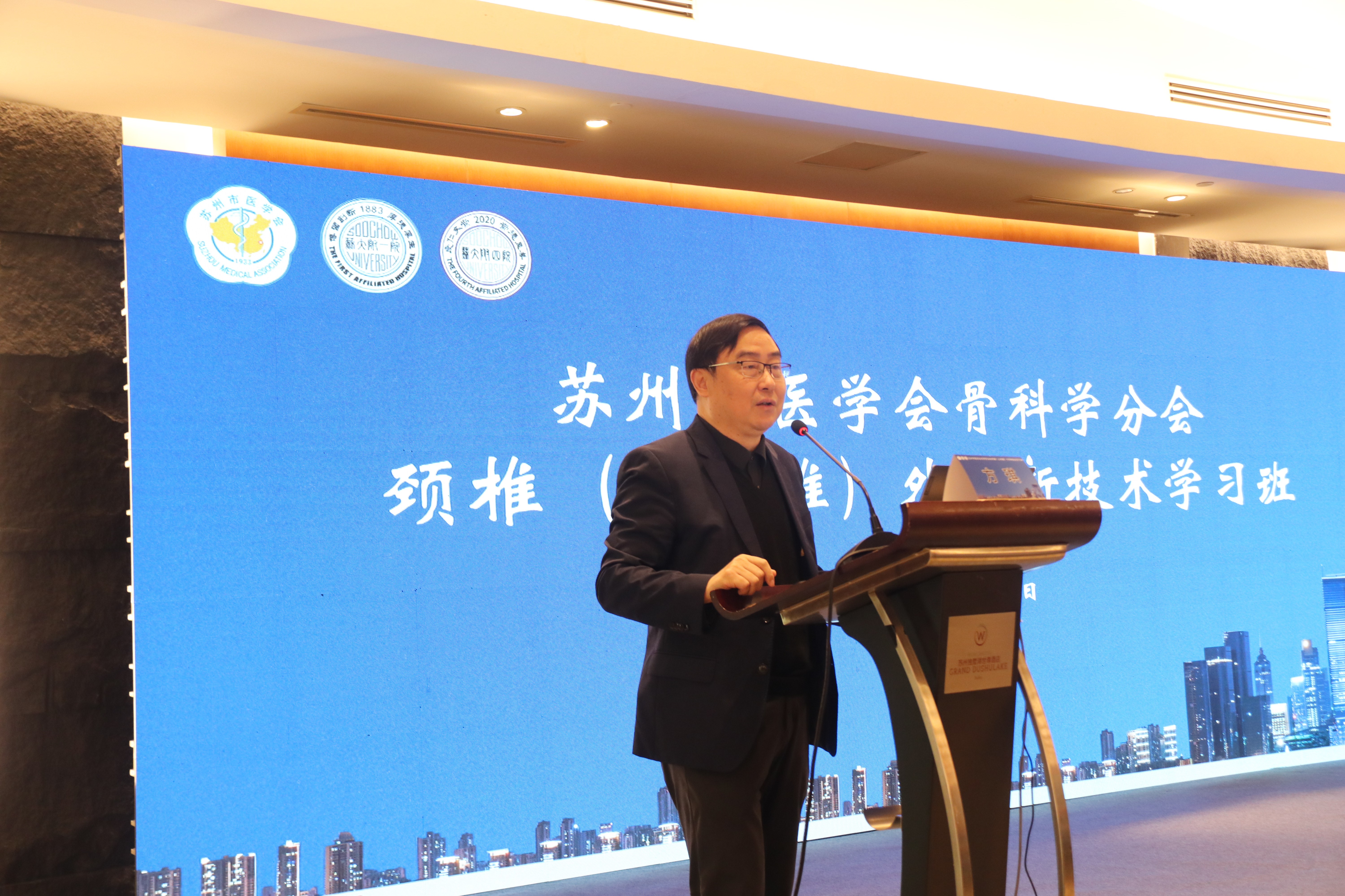 苏大附四院院长方琪致辞,他首先对各位专家教授的到来表示诚挚的欢迎与感谢。随后,他向与会专家介绍了苏大附四院发展的战略蓝图,展望了苏州大学附属第四医院高质量发展的广阔前景。方院长表示,苏大附四院骨科获评江苏省临床重点专科,已持续开展了多种疑难复杂手术,医院将继续给予支持,持续赋能专科建设,助力骨科专业迈向更高水平、实现长远发展。