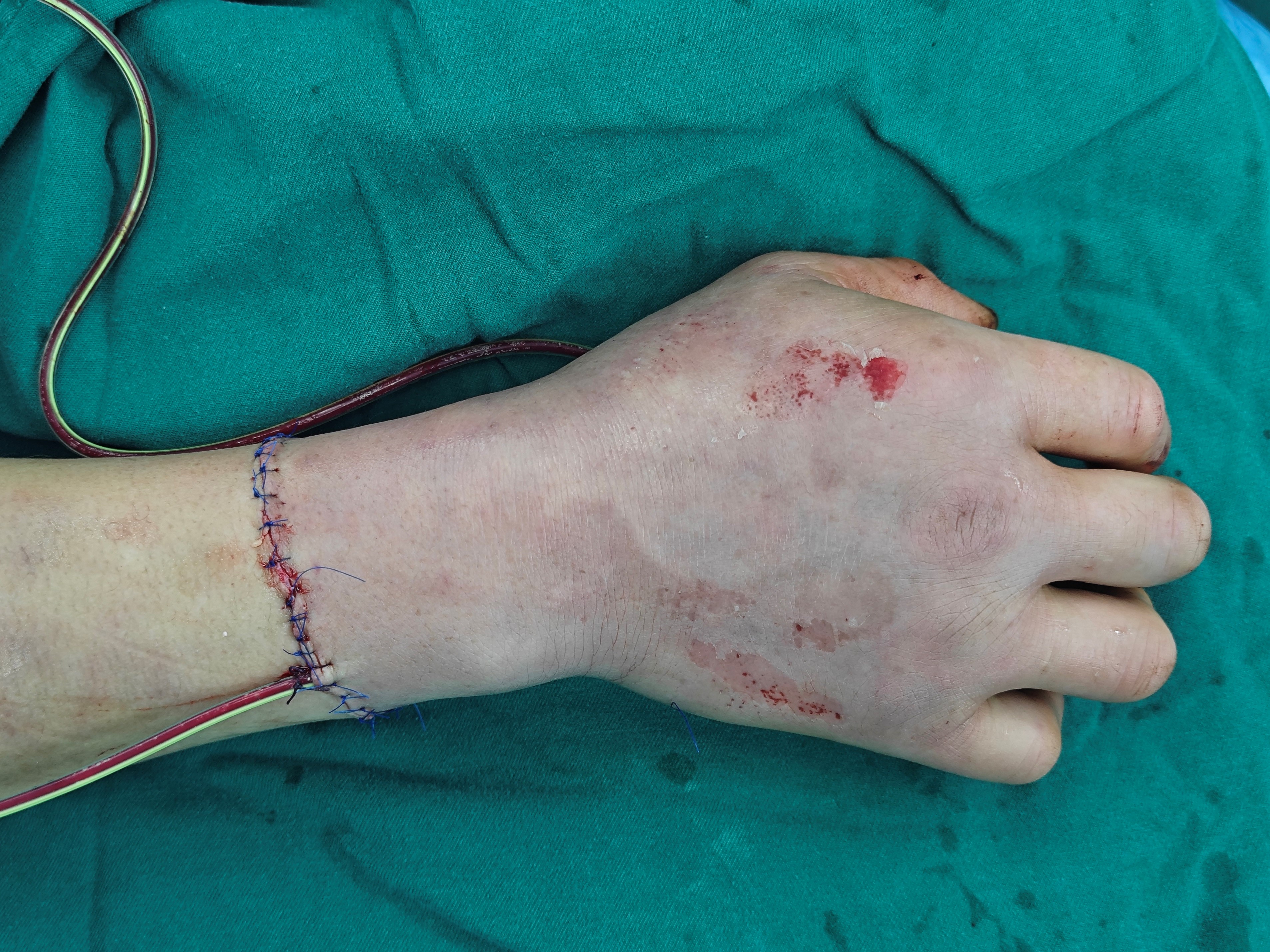 患者入院后,整形外科第一时间进行会诊。考虑到伤情危急且复杂,由沈国良主任医师和张建超副主任医师紧急组织召开病情讨论会。在讨论中沈国良主任医师重点指出,患者皮肤脱套范围广、组织挫伤重,还伴随骨折和肌腱损伤,若处理不当,不仅可能面临组织坏死、截肢风险,还会严重影响后续手部功能。经过对患者伤情的全面评估和反复研讨,团队最终达成一致:决定为患者实施脱套组织原位显微再植术,尽可能保留“原装”组织以及恢复手部外形与功能。
