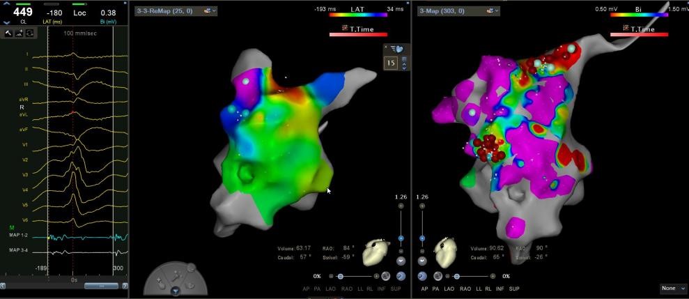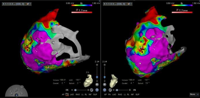 王林林主任医师谨慎操作,成功进入心外膜达到病变位置。术中,患者反复自发多形态室速,且转为室扑,同时出现血流动力学不稳定,需多次电除颤方能终止发作,标测难度极大。这就要求医疗团队必须在有限的标测时间内精准定位室速消融靶点,并结合心内外膜基质特征制定消融策略。经针对性消融后,患者未再自发室速,且室性早搏转为单一形态,经判定为右心室乳头肌来源,随即予以一并消融。术后经心室程序电刺激验证,室速未再被诱发。