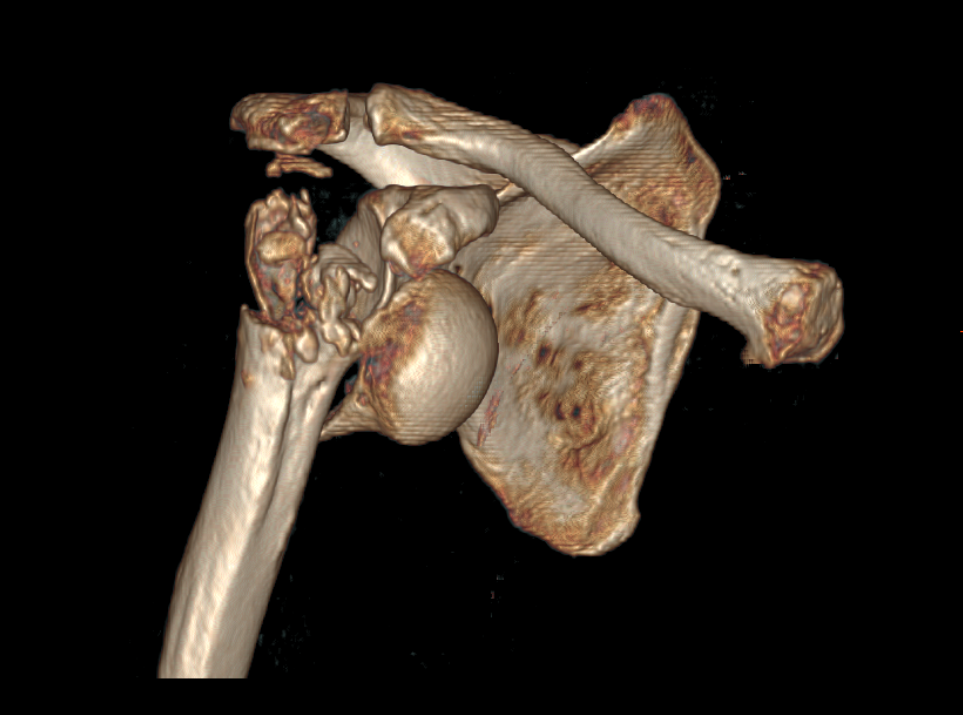 术前CT重建示右肱骨头及大小结节粉碎性骨折伴关节脱位